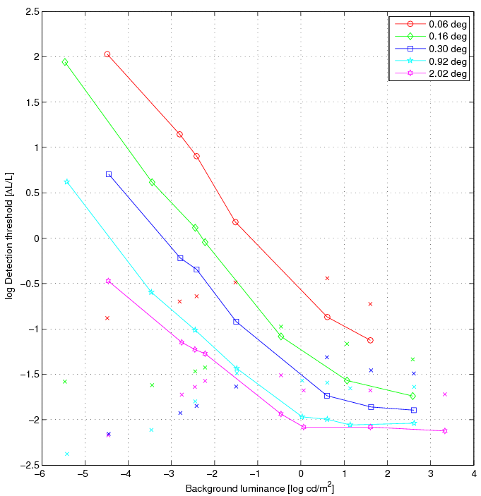 In a laboratory built for the purpose of these measurements, over 400,000 observations have been recorded and manually analyzed to determine detection thresholds for circular disks of different sizes (from 0.06 to 2 deg diameter) shown on a uniform adapting field (from 10-5 to 103.5 cd/m2).