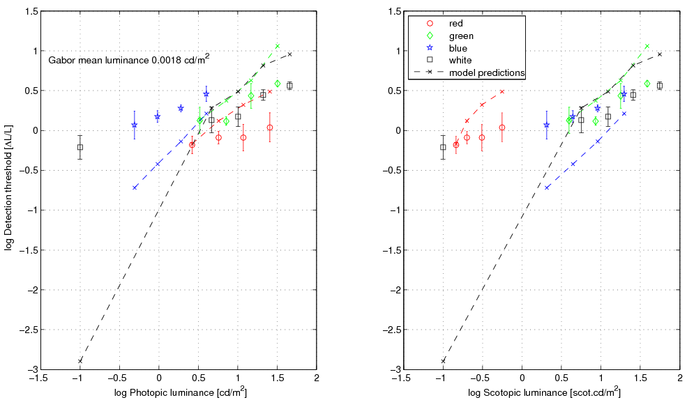 This data set shows glare comming from a large color light source affects detection thresholds at low luminance levels. The original data from: Mantiuk R, Rempel AG, Heidrich W. Display considerations for night and low-illumination viewing. In: Proc. of Symposium on Applied Perception in Graphics and Visualization - APGV ’09. 2009:53-58. link.