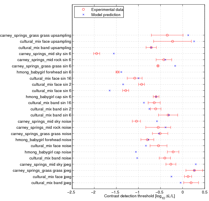 The metric uses the default parameters from the paper except the masking slope, set to 0.9 for all bands, which was found from fitting the metric to the masking data sets. One optional component in the VDP is computing contrast in the cortex filtered images, which could be either global or local. This version uses global contrast.
