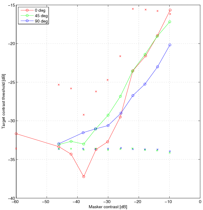 The stimuli contain the detection thresholds for a Gabor patch in the presence of a masking signal. The masking signal has the same frequency as the Gabor patch. The orientation of the masking signals is 0 deg (the same orientations as the Gabor), 45 deg or 90 deg.