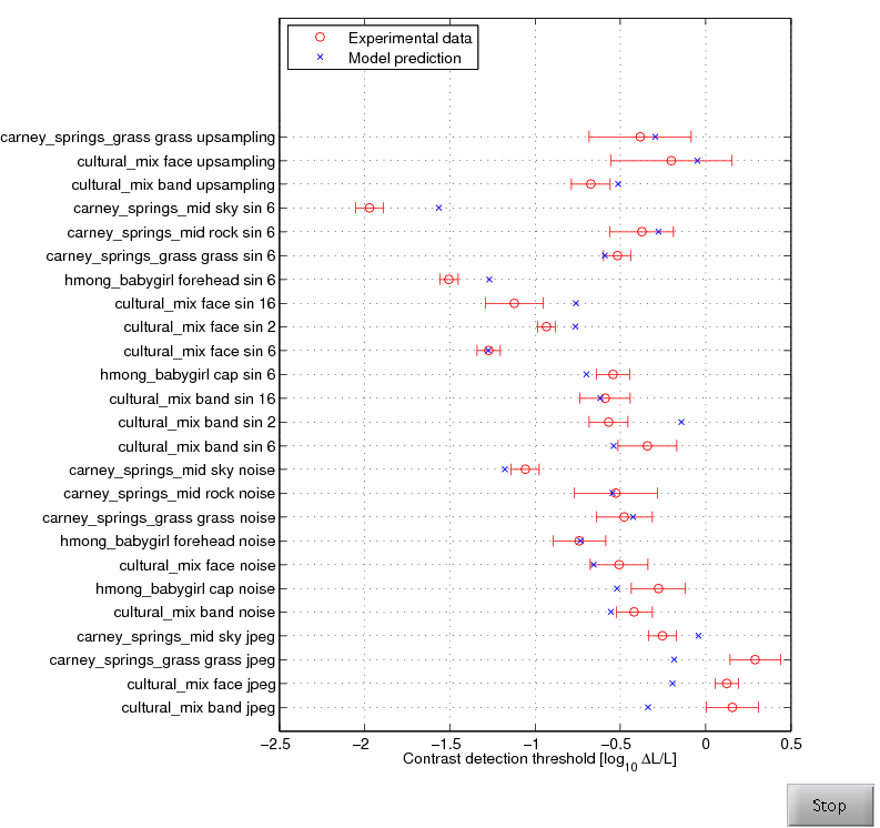 This data set was measured for comprehensive testing of visual models using actual distortions and complex images. The distortions are white-noise, JPEG compression artifacts, bilinear upsampling (blurring), and sine-gratings. All distortions are restricted to a small image regions to simplify the measurements.