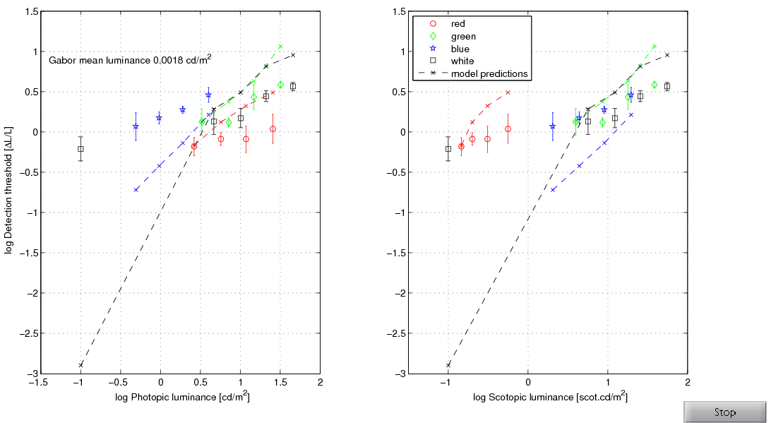 This data set shows glare comming from a large color light source affects detection thresholds at low luminance levels. The original data from: Mantiuk R, Rempel AG, Heidrich W. Display considerations for night and low-illumination viewing. In: Proc. of Symposium on Applied Perception in Graphics and Visualization - APGV ’09. 2009:53-58. link.